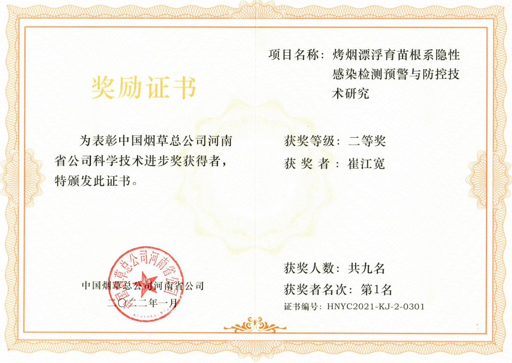 蒋士君教授团队与平顶山市烟草公司烟牵头的科研成果——“烤烟漂浮育苗根系隐性感染检测预警与防控技术研究”荣获河南省烟草公司科技进步二等奖。