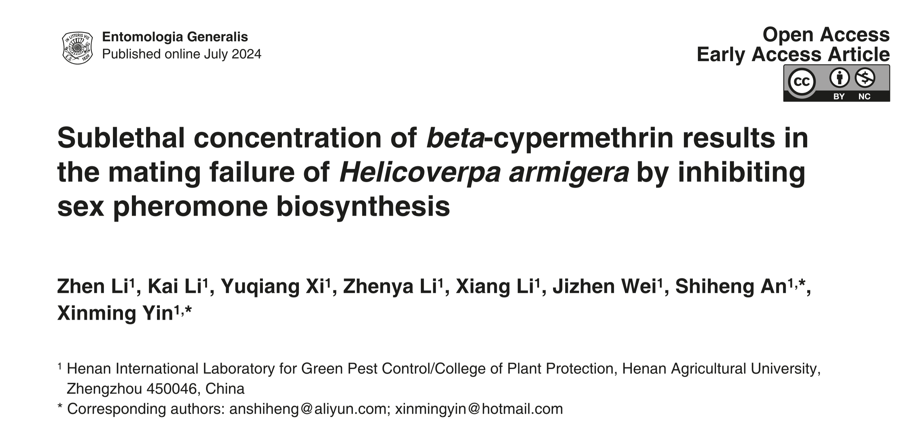尹新明教授团队/安世恒教授课题组在昆虫学TOP期刊中国科学院一区《Entomologia Generalis》杂志在线发表了题为“Sublethal concentration of beta-cypermethrin results in the mating failure of Helicoverpa armigera by inhibiting sex pheromone biosynthesis”的研究论文。研究揭示了亚致死浓度的高效氯氰菊酯通过抑制性信息素的生物合成导致棉铃虫交配失败的机制。