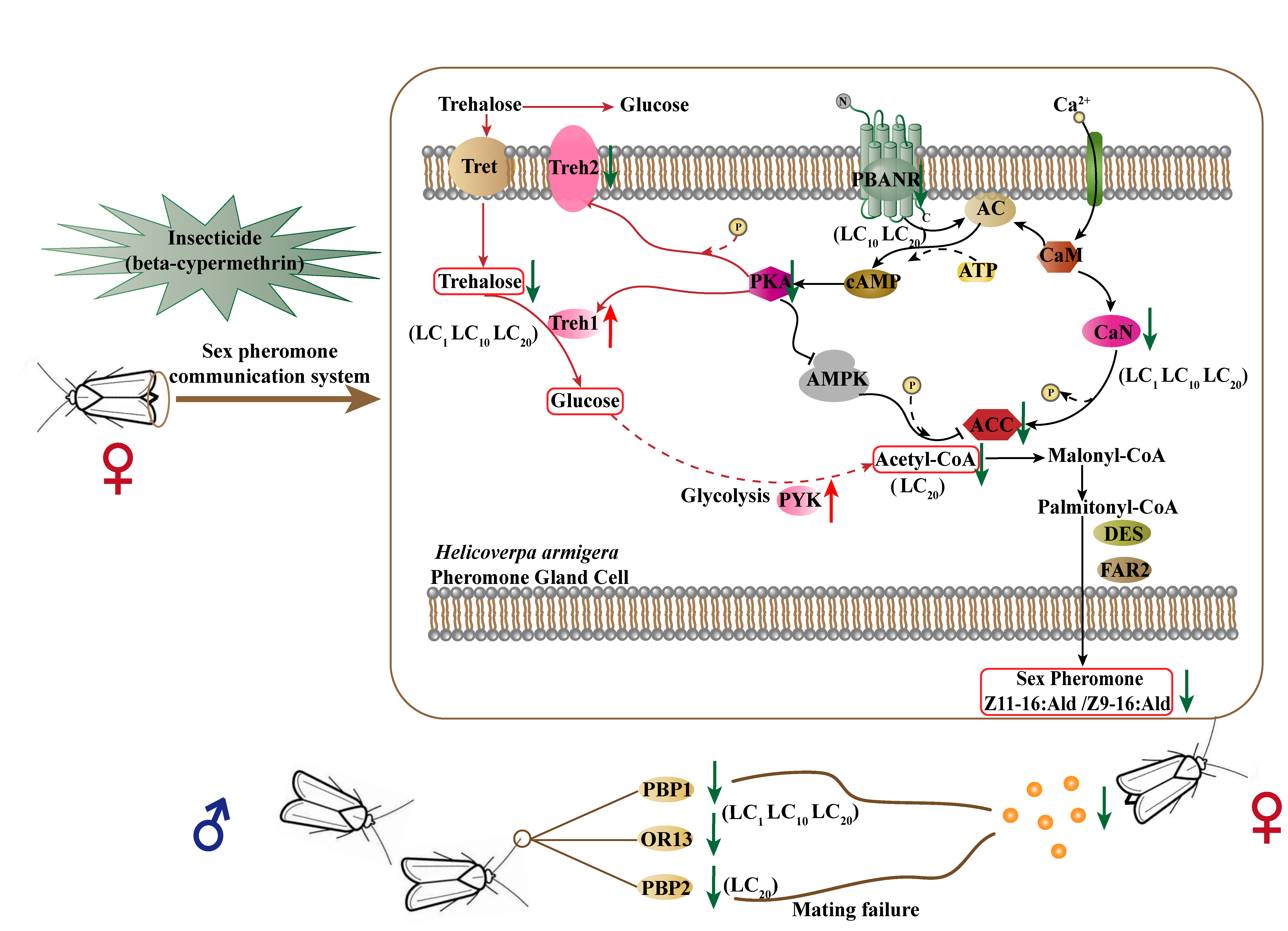 高效氯氰菊酯是农田防治棉铃虫等主要农业害虫的常用杀虫剂。本文研究了高效氯氰菊酯对棉铃虫交配生理的亚致死效应。结果表明,亚致死剂量的氯氰菊酯显著降低了雌蛾性信息素生物合成和吸引雄虫的能力,进而降低了交配率。深入的机制研究发现,在亚致死浓度的高效氯氰菊酯处理后,雌蛾性信息素腺体(PGs)中的海藻糖含量显著下降,乙酰辅酶A含量降低,海藻糖转运蛋白,钙调磷酸酶(CaN),乙酰辅酶A羧化酶(ACC)、蛋白激酶A (PKA)、信息素生物合成激活神经肽受体(PBANR)、去饱和酶Δ11-desaturase (DES)和脂肪酸还原酶2 (FAR2) 的表达水平显著降低,以及膜结合海藻糖酶、ACC、CaN和PKA的酶活性降低。亚致死剂量暴露降低了棉铃虫雄虫的信息素结合蛋白(PBP1)、信息素结合蛋白2(PBP2)和气味受体13(OR13)的表达水平,雄虫识别性信息素的能力下降。总之,亚致死剂量的高效氯氰菊酯暴露导致性信息素合成的前体物质(海藻糖、乙酰辅酶A)减少,性信息素的生物合成和雌虫吸引力的降低,以及雄虫的识别能力的降低,最终导致交配失败。这项研究提高了关于亚致死农药暴露如何影响害虫生物学及其作用机制的认识,为害虫管理策略提供了基础。