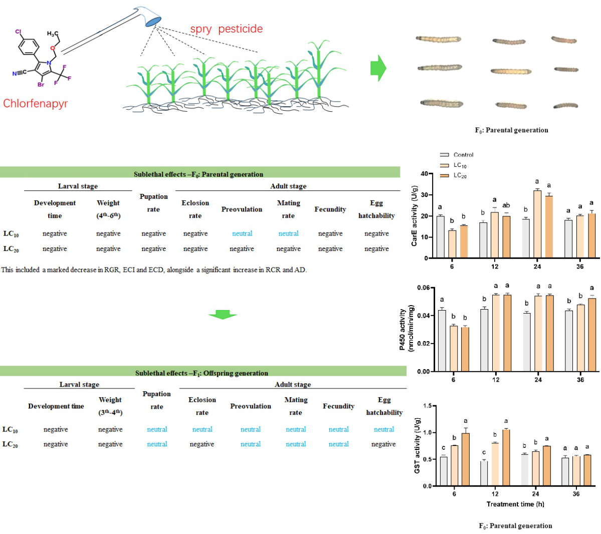 草地贪夜蛾被联合国粮农组织列为全球预警的严重威胁粮食作物的农业害虫,如果防控不及时,将对玉米主产区造成不同程度的产量损失。作为我国草地贪夜蛾应急防控的主要药剂之一,虫螨腈已广泛应用于田间防控。本研究系统探讨了虫螨腈对草地贪夜蛾的亚致死效应及其跨代影响。结果表明,亚致死剂量虫螨腈显著延长了幼虫期和产卵前期,并显著降低了F0和F1代幼虫体重、化蛹率和羽化率。此外,亚致死剂量还明显降低了F0代的交配率、繁殖力和卵孵化率亚致死浓度(LC20)的虫螨腈对F1代生命表种群参数也产生了负面影响,包括内在增长率(r)、周限增长率(λ)、净增殖率(R0)和种群加倍时间(Dt)。F0代与生长发育有关的摄食指标显著被抑制,包括相对生长率(RGR)、食物转化率(ECI)、食物利用率(ECD)和相对消耗速率(RCR),但近似消化率(AD)显著增加。在暴露于亚致死剂量的虫螨腈12至24小时后,草地贪夜蛾幼虫的羧酸酯酶(CarEs)、细胞色素P-450s(P450s)和谷胱甘肽S-转移酶(GSTs)活性增加。值得注意的是,与对照组相比,处理6 h后,GSTs活性显著增加,而CarEs和P450s活性显著降低。上述结果表明,亚致死剂量的虫螨腈显著抑制了草地贪夜蛾的生长发育,并对F1代的种群发展产生了负面影响。此项研究为虫螨腈在重大农业害虫综合治理策略中的合理施用提供科学依据,同时也为进一步探索农业环境中杀虫剂毒理学效应提供了新的视角。
