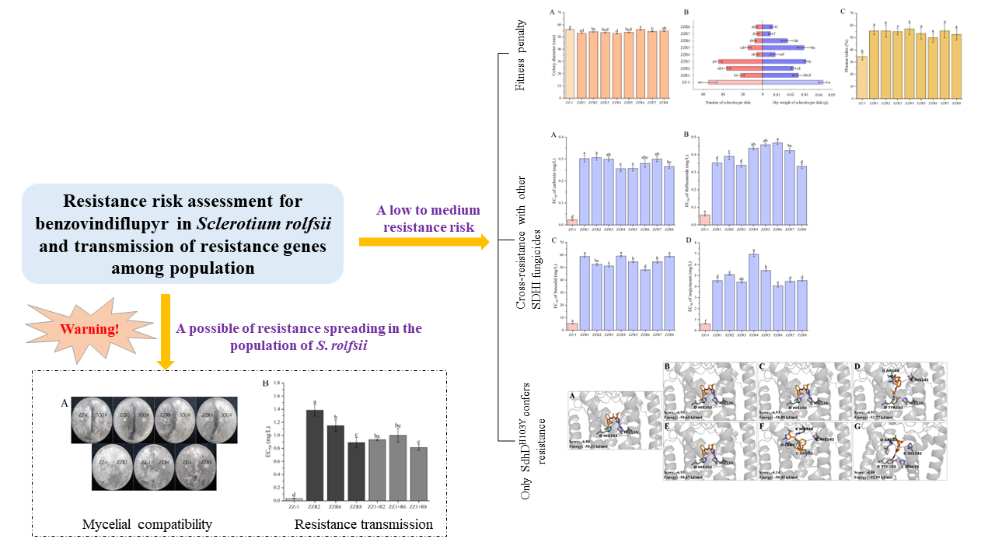 该研究通过室内化学诱导苯并烯氟菌唑抗性菌株,比较了抗性菌株和野生型(敏感)菌株的适合度,发现抗性菌株的致病力虽然更强,但其在菌丝生长和菌核形成方面存在适合度代价。苯并烯氟菌唑与噻呋酰胺、萎锈灵、啶酰菌胺和吡唑萘菌胺存在正交互抗性,不建议苯并烯氟菌唑与这些杀菌剂混用或轮用,避免杀菌剂抗性的发展。虽然抗性菌株存在SdhBN180D、SdhCQ68E和SdhDH103Y三个突变位点,但分子对接结果显示,只有SdhDH103Y可导致苯并烯氟菌唑抗性。同时,该研究首次发现,苯并烯氟菌唑抗性菌株和敏感菌株可通过菌丝融合促进抗性基因在白绢病菌不同菌株间传递,说明一旦产生杀菌剂抗性,就有可能在白绢病菌种群中大规模扩散。