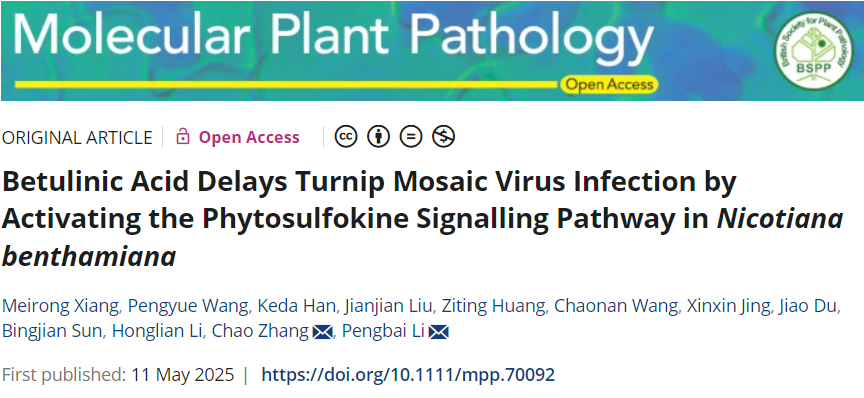 李洪连教授团队/张超教授课题组在植物病理学权威期刊《Molecular Plant Pathology》在线发表了题为“Betulinic acid delays turnip mosaic virus infection by activating the phytosulfokine signalling pathway in Nicotiana benthamiana”的研究论文。该研究系统揭示了植物源物质-白桦脂酸通过激活本氏烟PSK-PSKR信号通路,抵御芜菁花叶病毒侵染的分子机制。