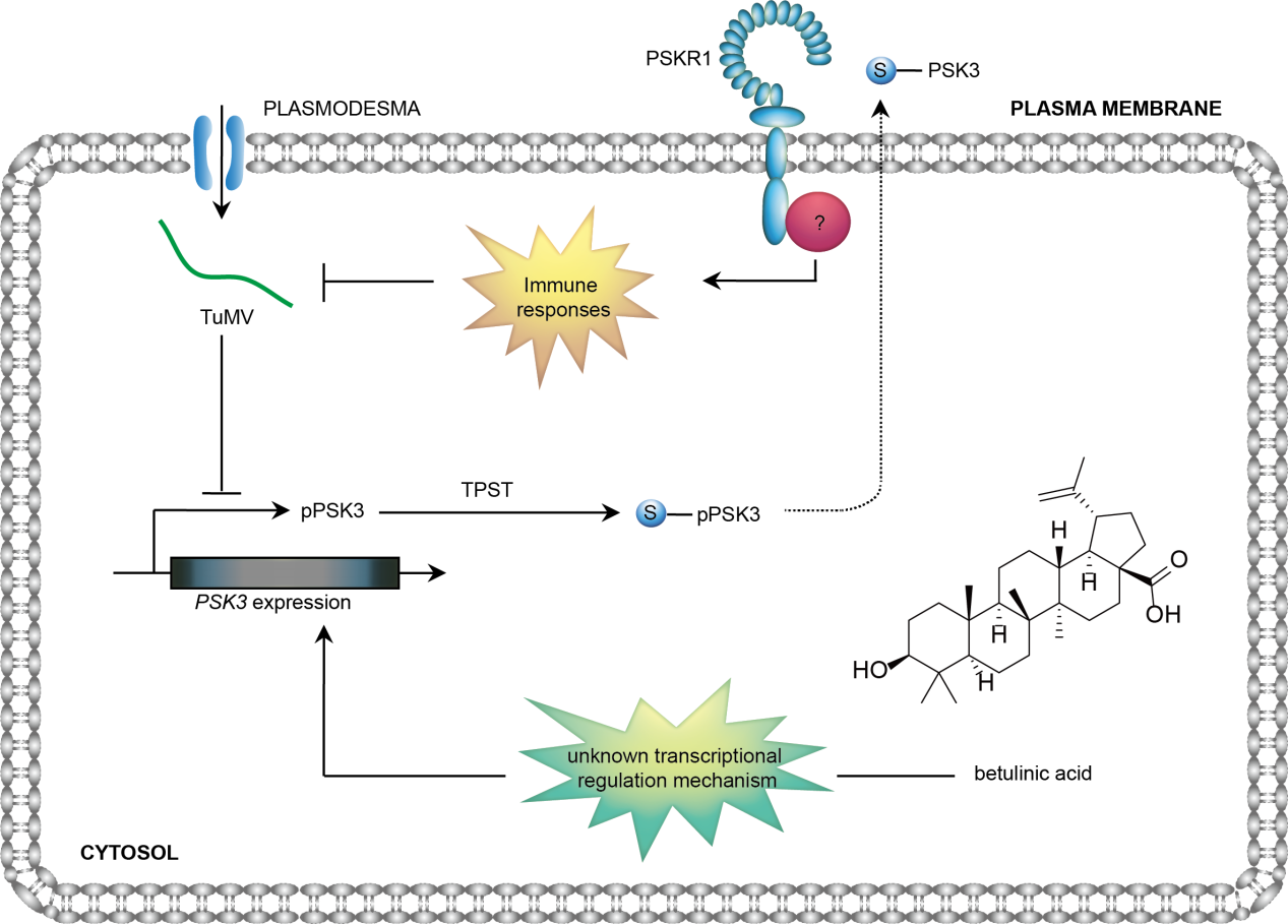 植物病毒病是农业生产中极具威胁的病害之一,素有“植物癌症”之称。芜菁花叶病毒(turnip mosaic virus, TuMV)是马铃薯Y病毒科(Potyviradae)、马铃薯Y病毒属(Potyvirus)的单分体正义单链RNA病毒,近年来TuMV在全球范围内广泛传播,对蔬菜及芸薹属作物造成极大危害。目前尚无有效的化学药剂防治植物病毒病。白桦脂酸(Betulinic acid, BA),又名桦木酸,是一种具有五环羽扇豆烷型的三萜化合物,在自然界中,广泛存在于桦木属植物中。本研究发现,BA处理可以显著延迟TuMV在本氏烟中的侵染。结合转录组学测序发现,BA处理特异性诱导了NbPSK3基因的表达,且NbPSK3正调控本氏烟对TuMV的侵染。沉默PSK受体(PSKRs)同样可以促进病毒侵染。进一步研究发现,外源PSK多肽处理显著增强本氏烟对TuMV的抗性,且BA对TuMV侵染的抑制作用依赖于PSK-PSKR信号通路。本研究阐明了植物源物质BA抗病毒的分子机制,对今后植物病毒病害绿色防控具有重要意义。