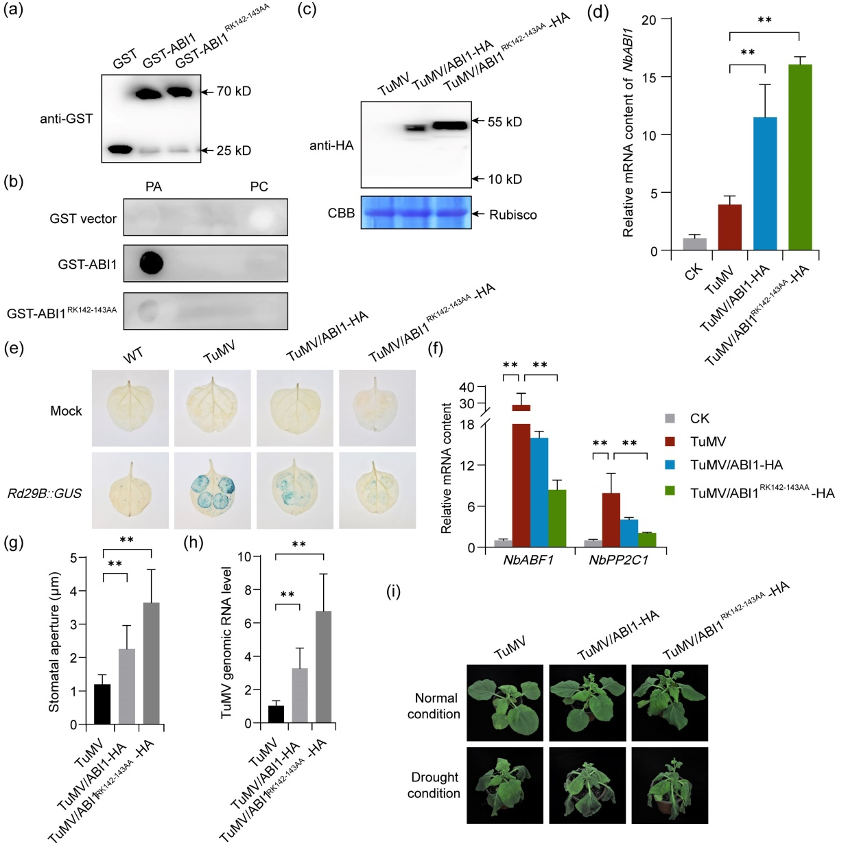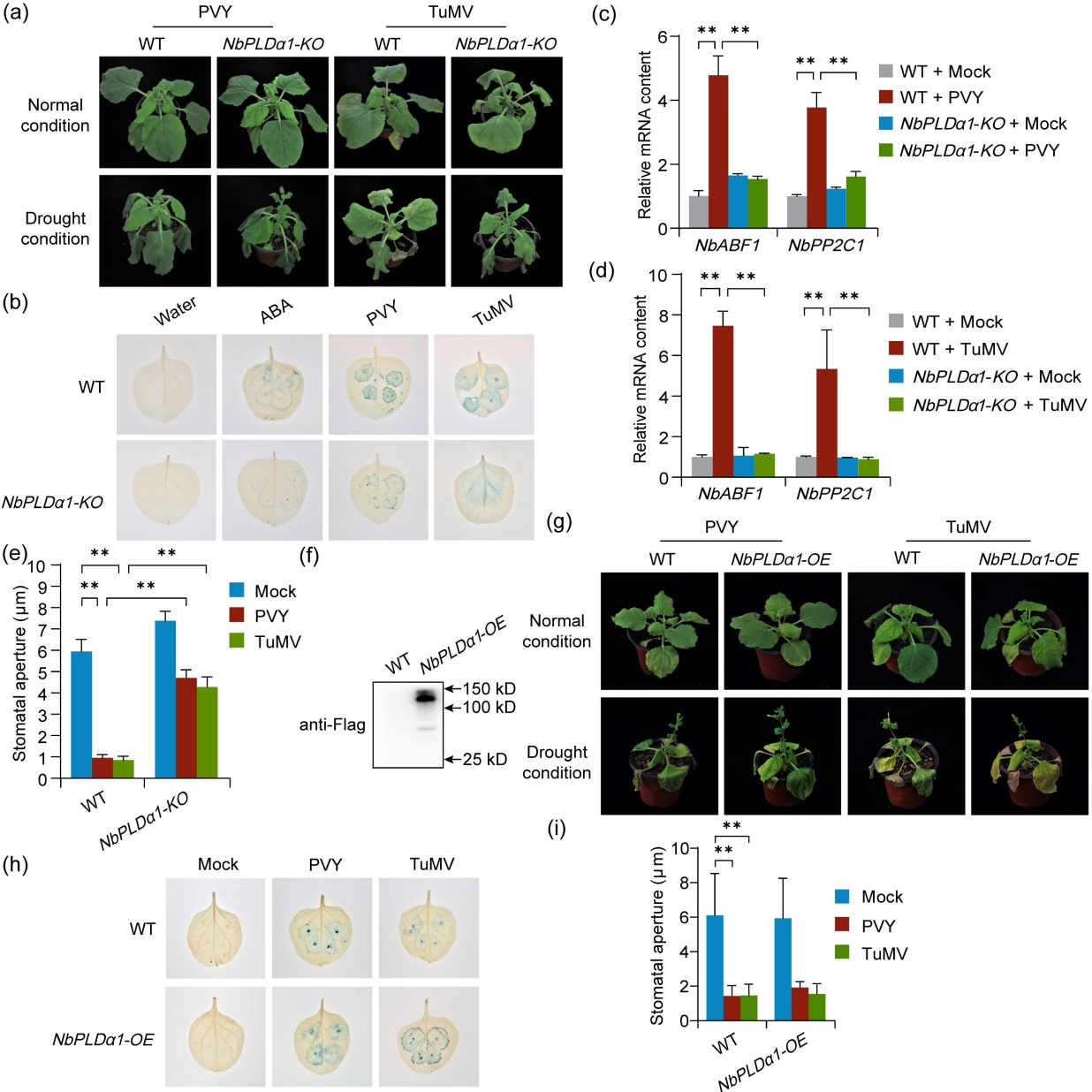 作者之前的研究已经报道PVY编码的6K2蛋白与寄主磷脂酶Dα1(PLDα1)互作,并提高叶片磷脂酸含量(Plant Communications,2024)。本研究发现,单独表达病毒6K2蛋白即可诱导脱落酸下游转录激活并提高抗旱能力。敲除PLDα1显著抑制了病毒诱导的转录激活、气孔关闭以及抗旱能力(图2)。通过点突变改变6K2与PLDα1的互作能力,则6K2丧失了诱导转录激活与气孔关闭的能力,表明PVY通过编码的6K2蛋白调控PLDα1及其产物磷脂酸,提高植物抗旱能力。