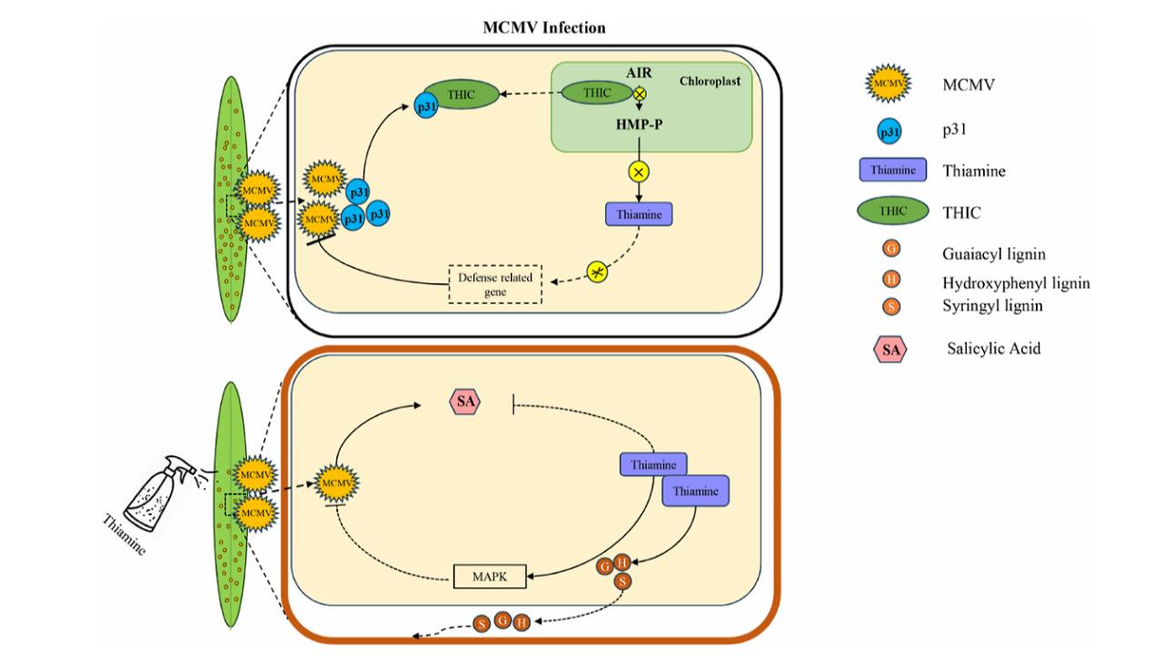 硫胺素(thiamine)又称为维生素B1(vtamin B1, VB1)是所有生物体必需的微量营养素。可作为诱导剂增强植物抗性,激发防御反应以提高对病原体的抵抗力。目前,硫胺素的抗病毒机制尚不清楚。本研究以玉米褪绿斑驳病毒(Maize chlorotic mottle virus, MCMV)为模型,阐明硫胺素的抗病毒机制。MCMV是番茄丛矮病毒科(tombusviridae)玉米褪绿斑驳病毒属(machlomovirus)的唯一成员。施用硫胺素可增强玉米对 MCMV 的抗性。转录组测序表明,MCMV侵染会影响玉米中硫胺素合成途径相关基因的表达。此外,MCMV P31蛋白在细胞质中与硫胺素合成关键因子ZmTHIC互作,并阻止ZmTHIC进入叶绿体。利用黄瓜花叶病毒(CMV)诱导的基因沉默系统,在玉米中沉默了ZmTHIC,结果显示与对照植株相比,MCMV积累量更高。LC-MS分析显示,ZmTHIC沉默和MCMV侵染均会降低玉米中的硫胺素含量。在MCMV侵染前用硫胺素处理,可通过激活丝裂原活化蛋白激酶(MAPK)通路并促进植物细胞壁中木质素的合成,增强植物防御反应,从而增强植物抗性。本研究为硫胺素的抗病毒机制提供了新见解,对植物病毒病的绿色防控具有重要意义。