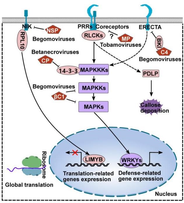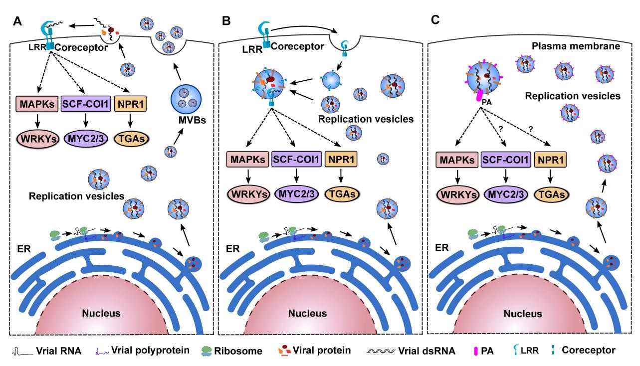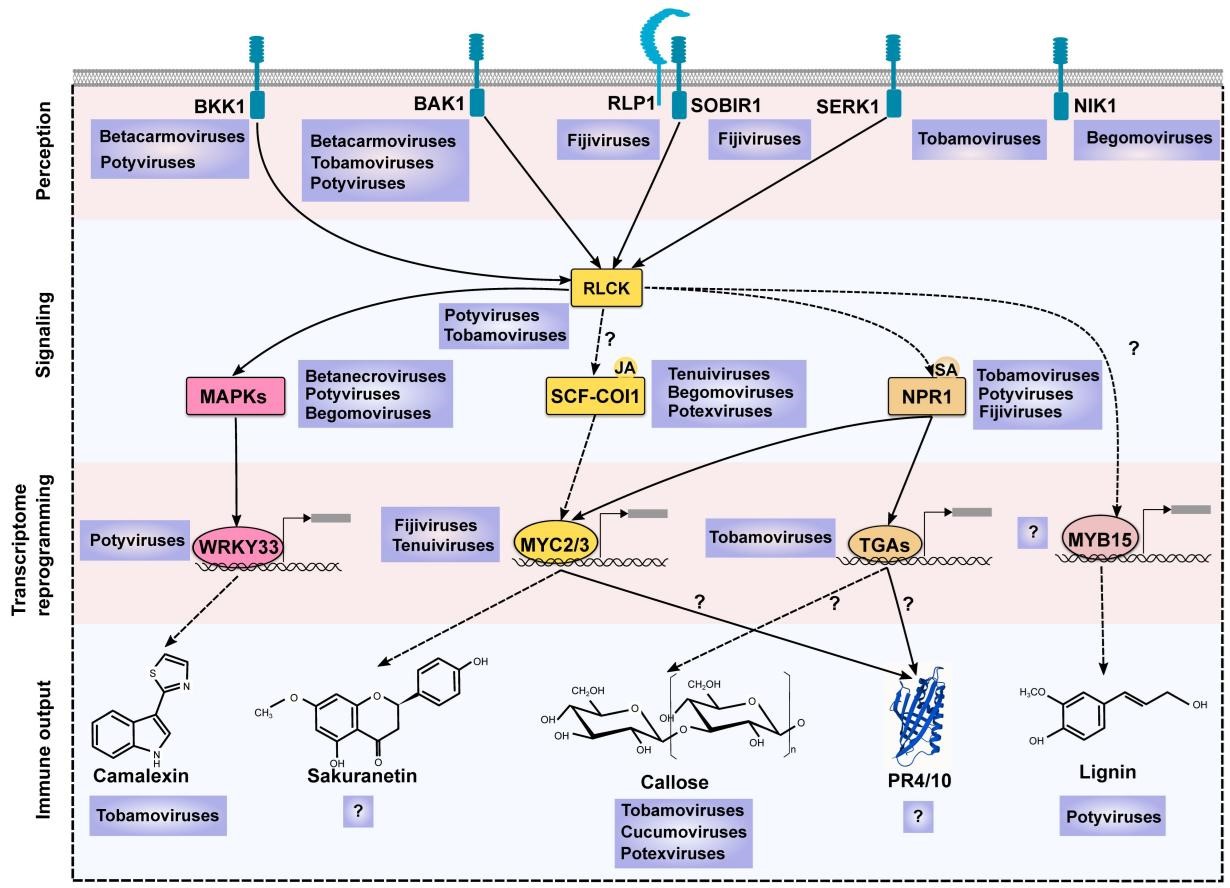然而,与其它病原物不同,病毒是一种非细胞生物,在寄主细胞外不进行代谢反应,仅通过病毒核酸和衣壳蛋白维持稳定性,因此被视为非生命实体。理论上,植保素等直接杀伤病原细胞的抗病物质无法有效“杀死”病毒颗粒。此外,植物病毒不需主动侵入细胞,而是借助昆虫取食造成的伤口或机械损伤造成的微伤口被动进入植物细胞。并且一旦进入植物细胞,病毒可以通过胞间连丝扩散至整个植株,无需离开细胞。因此PTI诱导的木质素沉积等细胞壁抗性似乎对病毒无效。这些问题引发了人们对PTI免疫途径是否具有抗病毒作用的质疑。