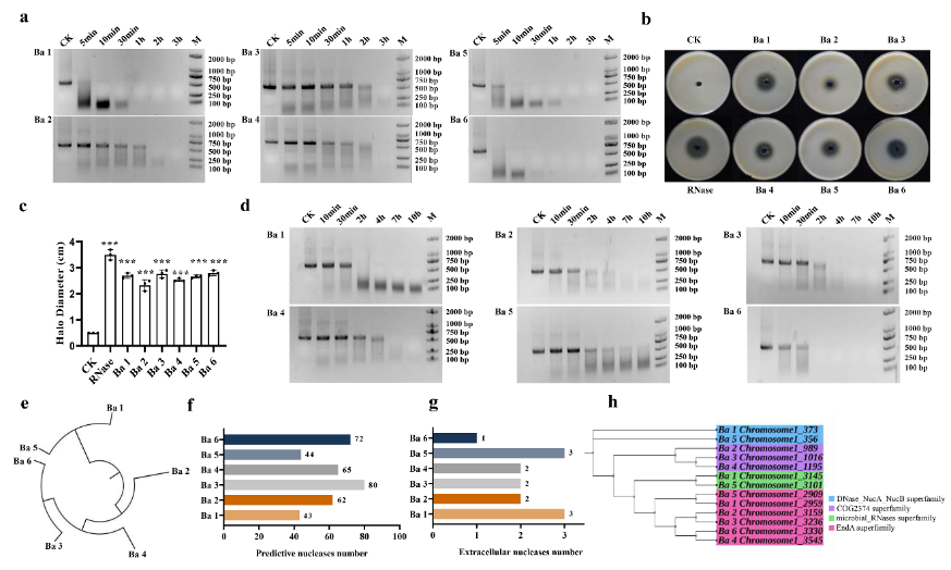 该研究首先通过体外培养和宏基因组测序,从棉铃虫肠道中分离出6株具有dsRNA降解活性的芽孢杆菌(Bacillus),并通过凝胶电泳和RNase活性检测验证其降解能力。筛选出的6株共生菌的菌液和上清在体外都能够快速降解dsRNA。通过全基因组测序分析鉴定出各共生菌编码外泌核酸酶的基因。