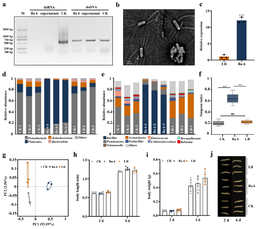 图 2. 饲喂Ba 6对棉铃虫肠道菌群及生长发育的影响
