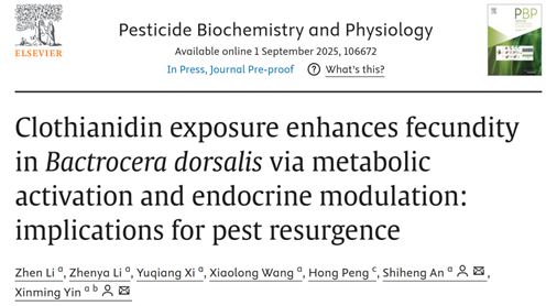 尹新明教授团队/安世恒教授课题组在昆虫学TOP期刊中科院一区《Pesticide Biochemistry and Physiology》杂志在线发表了题为“Clothianidin exposure enhances fecundity in Bactrocera dorsalis via metabolic activation and endocrine modulation: implications for pest resurgence”的研究论文。化学杀虫剂长期以来一直是农业害虫治理的重要手段。然而,本研究发现使用杀虫剂引起的“亚致死效应”,反而促进害虫种群的恢复与扩张。