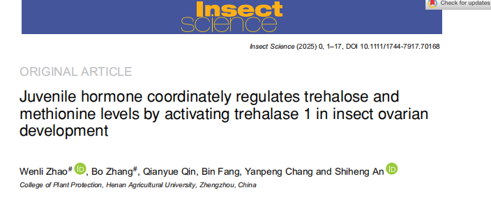 安世恒教授课题组在中科院一区TOP期刊《Insect Science》上发表了题为“Juvenile hormone coordinately regulates trehalose and methionine levels by activating trehalase 1 in insect ovarian development”的研究论文。该研究系统揭示了保幼激素JH通过激活海藻糖酶1(Treh1)协同调控海藻糖与甲硫氨酸代谢,从而促进棉铃虫(Helicoverpa armigera)卵巢发育的分子机制,为昆虫生殖调控与绿色防控靶标开发提供了重要理论依据。