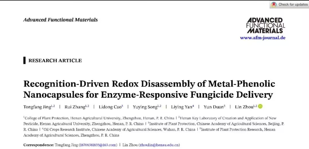 周琳教授团队在材料科学国际顶级期刊《Advanced Functional Materials》(IF: 19.4, Nature Index期刊)上发表了题为“Recognition-Driven Redox Disassembly of Metal-Phenolic Nanocapsules for Enzyme-Responsive Fungicide Delivery”的研究论文。该研究通过单宁酸(TA)、Fe3+和羧甲基纤维素钠(CMC)的自组装,构建了一种全新的“生物识别驱动”智能纳米农药递送系统,揭示了病原菌纤维素酶特异性结合TA从而加速Fe3+还原、触发纳米胶囊精准解体的全新机制,为攻克复杂土传病害的精准防控难题提供了新策略。
