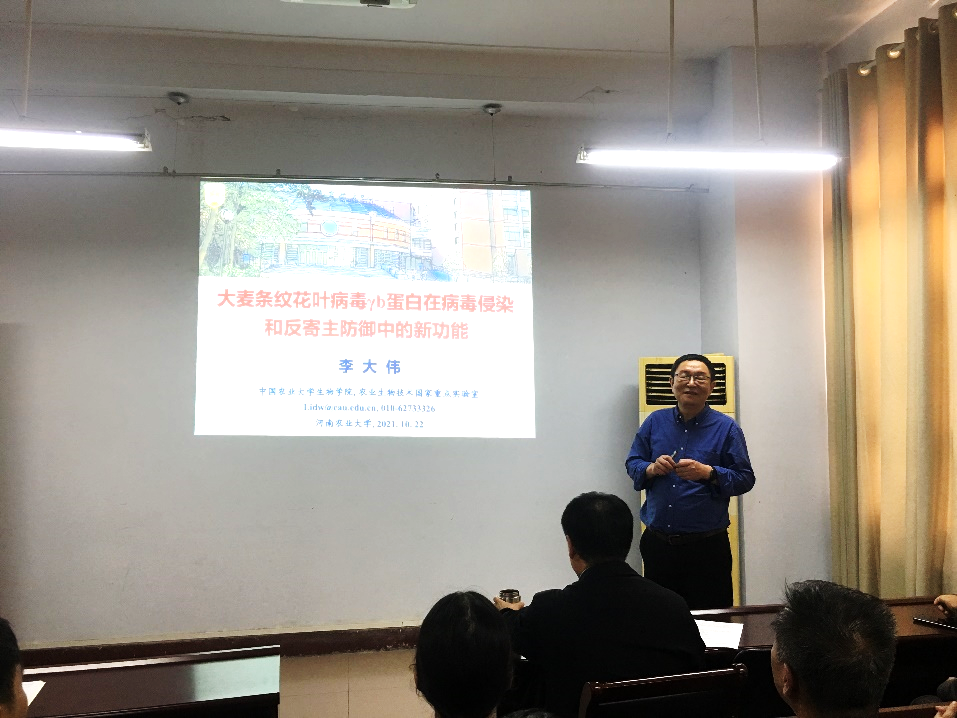 杰出校友、国家杰出青年基金获得者,中国农业大学生物学院李大伟教授回到母校进行学术交流,并做了题目为“大麦条纹花叶病毒γb蛋白病毒侵染和反寄主防御中的新功能”的学术报告。植保学院及相关学院师生参加了报告会,会议由学院院长李洪连教授主持。