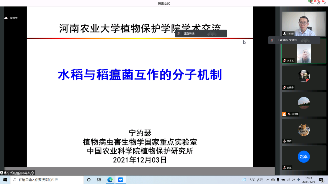 宁约瑟研究员以水稻的重要性和引起水稻产量损失达10%-30%的水稻全球性病害—稻瘟病开篇,深入浅出地讲解了团队近年来在水稻与稻瘟菌互作分子机制方面的最新研究进展。以AvrPiz-t在水稻中靶标蛋白的鉴定入手,从效应蛋白靶向水稻泛素蛋白酶体途径、钾离子通道复合体、转录因子和胰蛋白酶抑制剂等四个方面解析了稻瘟菌抑制水稻基础抗病性(PTI)的分子机制;从转录因子作为桥梁连通泛素连接酶对抗病蛋白调控的角度解析了稻瘟菌效应蛋白诱导水稻特异性抗病性(ETI)的分子机理。这些研究结果为稻瘟病综合防控提供了新思路。
