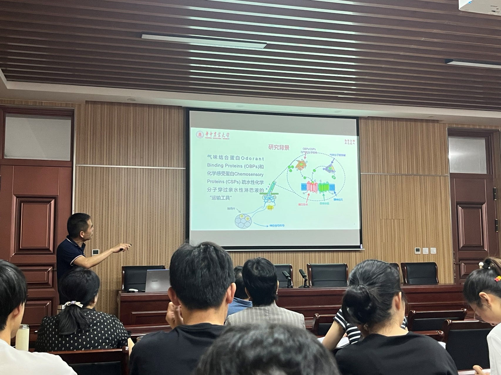 王满囷教授围绕昆虫嗅觉气味结合蛋白OBPs的生理功能、转录调控及其在昆虫-植物互作关系中的重要功能进行了详细报告,重点介绍了其近期的研究成果。通过聚焦“气味结合蛋白OBPs的功能分析”,建立基于OBPs的反向化学生态学研究体系,并深入解析OBPs在昆虫中的新功能;发现OBPs除了气味运载功能以外,还可以作为唾液中的效应子在植物组织中传递,激活植物的免疫反应,参与昆虫与植物的互作过程;最后对气味结合蛋白OBPs上游的转录调控机制进行了研究。报告内容生动丰富,与会师生受益良多。