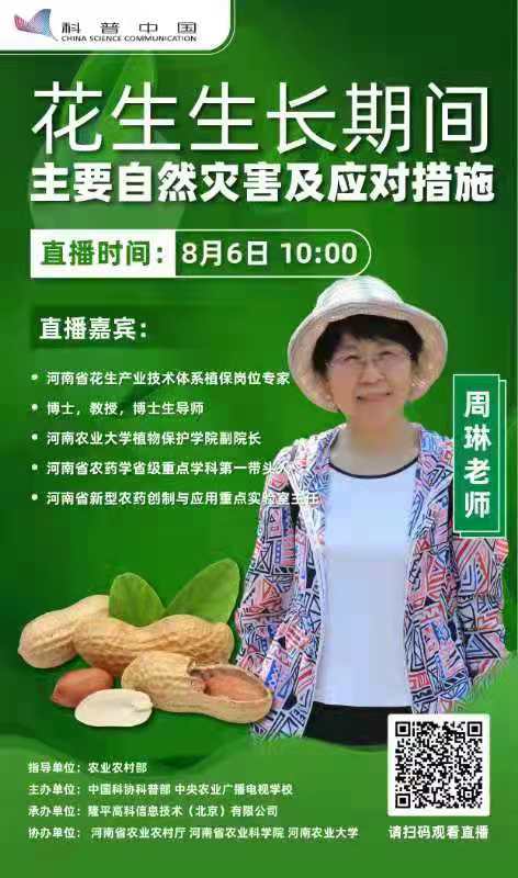 本网讯(通讯员 鲁兴)8月6日上午,河南省花生产业技术体系植物保护岗位专家、a动漫 周琳教授以"花生生长期主要自然灾害及应对措施"为主题,针对花生易遭受的涝灾、旱灾等气象灾害和病虫等生物灾害,从发生时期、症状表现、防控原理及具体应急措施等方面,在"科普中国"App上进行了线上直播培训,受益群众近万人次,理论深入浅出,技术实用可行,深受广大听众的好评和点赞!