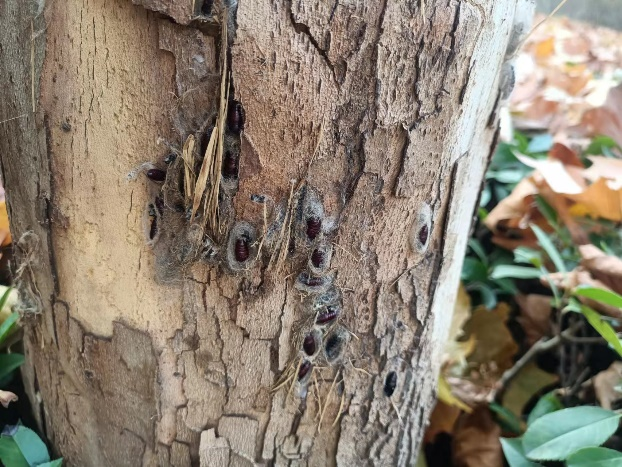 昆虫学系主任王高平副教授的现场考察指导,在部分悬铃木主干上绑草、引诱下树老熟幼虫草内化蛹越冬。