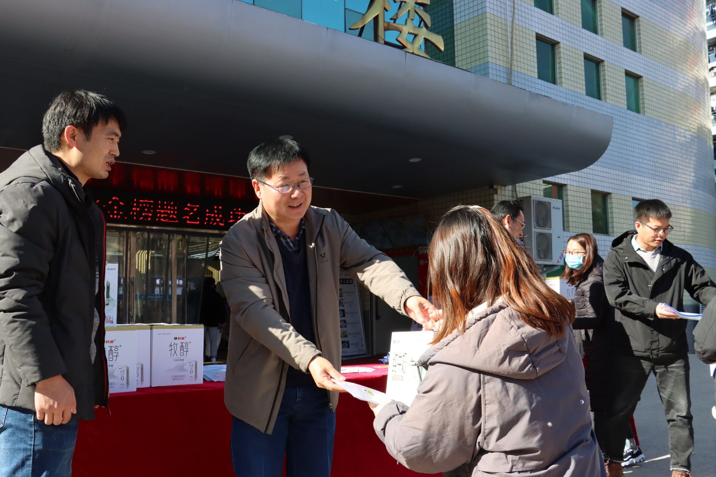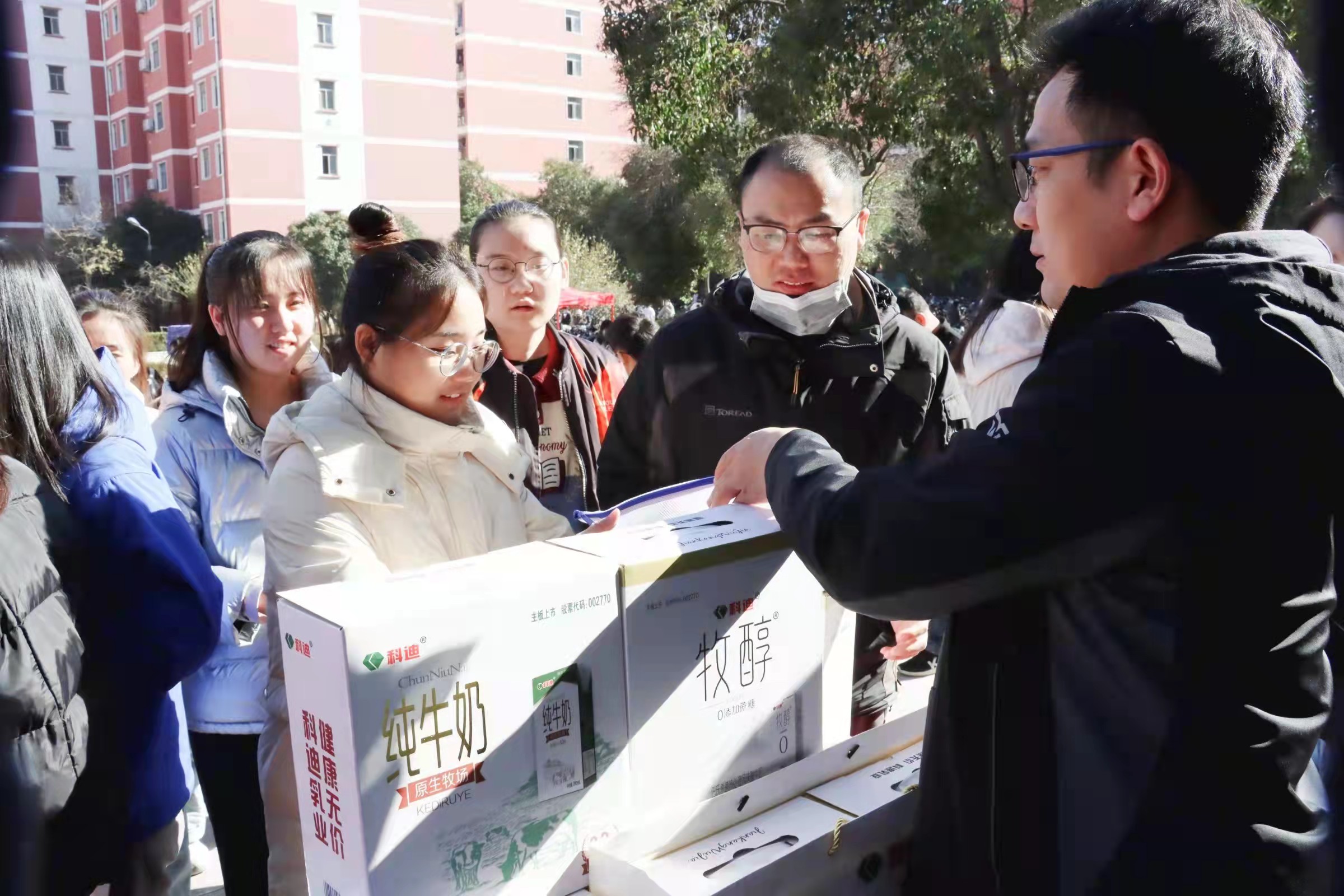 考研班主任为学生分发牛奶