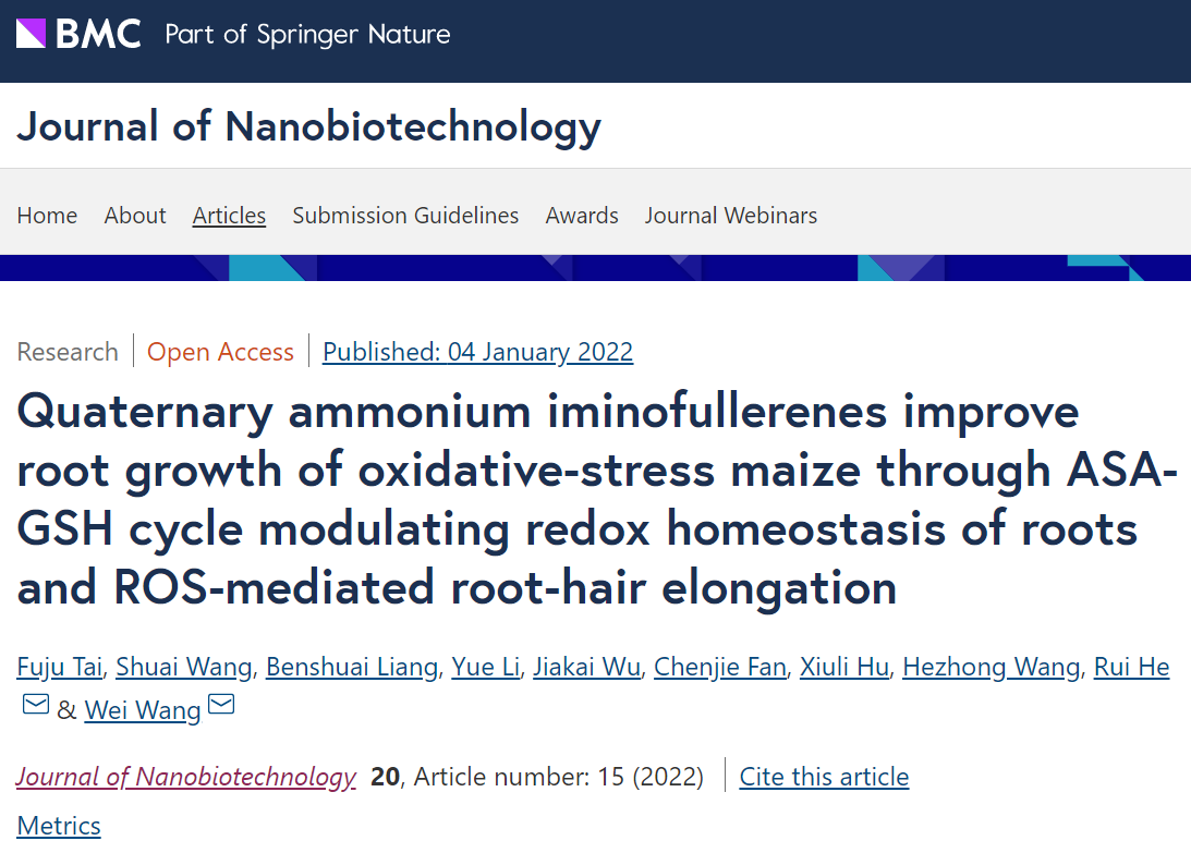 时尚该研究发现自主合成的阳离子型富勒烯水溶性衍生物(IFQA)作为新型碳纳米酶,具有体外抗氧化活性,可通过调控玉米NADPH氧化酶活性、根毛发育相关基因的表达水平,及根尖细胞抗氧化剂GSH 含量,平衡根尖ROS水平及细胞氧化还原状态,从而促进氧化胁迫下玉米根毛形成和根系生长。该研究首次报道碳纳米酶对氧化胁迫下玉米根毛发育的促进作用,这为IFQA作潜在的作物生长调节剂在生产中应用提供了依据(图1)。时尚该研究以题为“Quaternary ammonium iminofullerenes improve root growth of oxidative-stress maize through ASA-GSH cycle modulating redox homeostasis of roots and ROS-mediated root-hair elongation”的论文形式在线发表于国际知名期刊Journal of Nanobiotechnology(纳米生物技术杂志),该期刊(JCR一区,影响因子10.435)主要刊登医学和生物学领域的科技进展,尤其强调与纳米科学的交叉研究。这是继IFQA调节玉米干旱胁迫下萌发及根系生长机制研究(PPB, 2021;JAFC, 2019)后的又一成果。a动漫 生命学院邰付菊副教授为论文第一作者,硕士生王帅为共同第一作者,王伟教授和植保学院何睿副教授为共同通讯作者。该研究得到了国家自然科学基金((U1904107)、河南省自然科学基金(212300410354)、河南省科技攻关项目(202102110070)、a动漫 科技创新基金(KJCX2020C02)、中科院纳米生物效应与安全性重点实验室开放课题(NSKF201907)的资助。