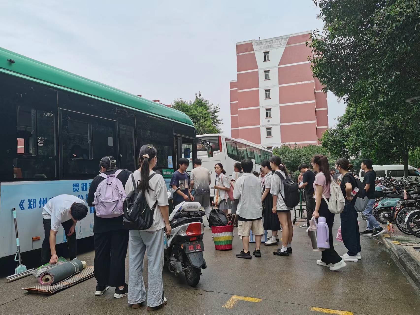 给学生分发储物袋并安排车辆帮助学生运送电动车和行李。