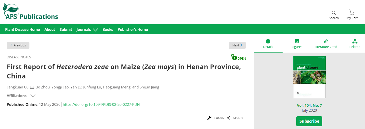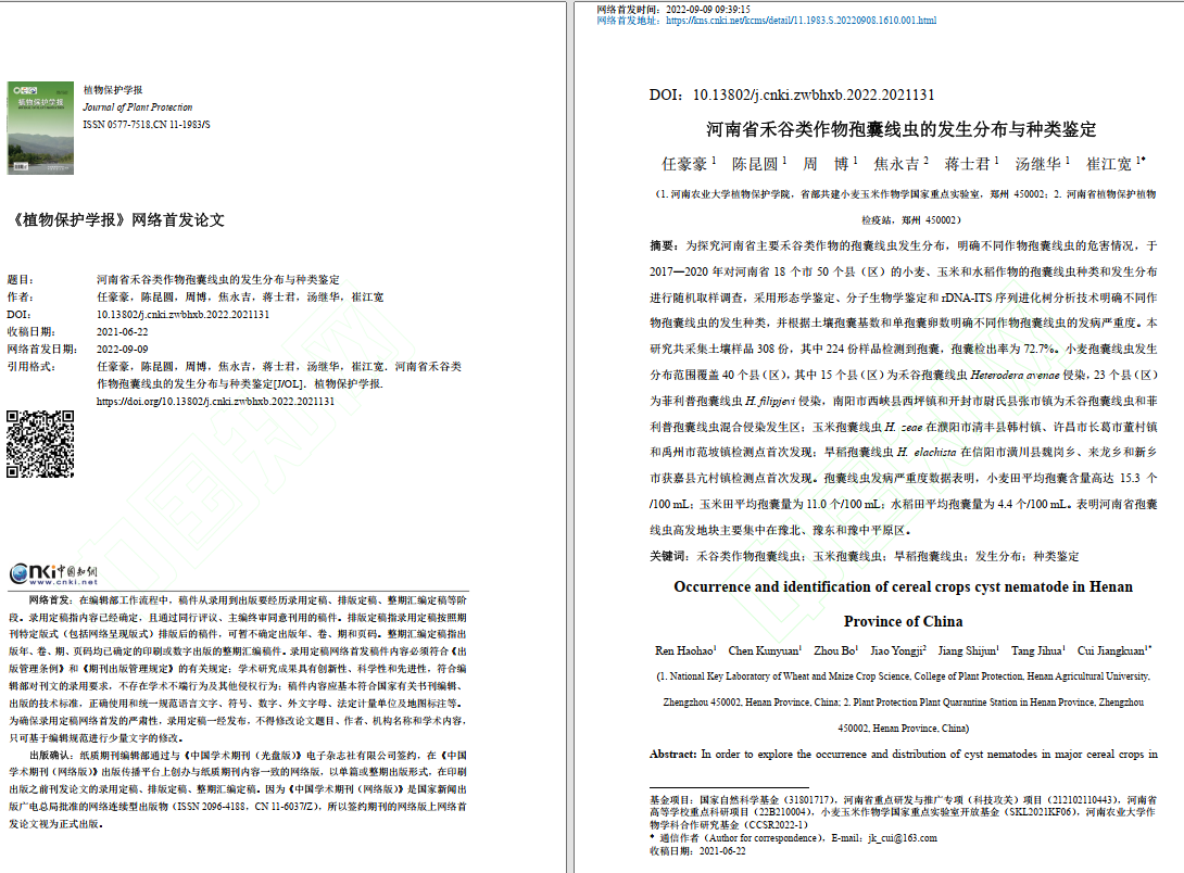为探究河南省主要禾谷类作物的孢囊线虫发生分布,明确不同作物孢囊线虫的为害情况,崔江宽博士于2017—2020年对河南省18个市50个县(区)的小麦、玉米和水稻作物的孢囊线虫种类和发生分布进行了系统取样调查。本研究共采集全省土壤样品308份,其中224份样品检测到孢囊,孢囊检出率为72.7%,覆盖调查地区的92.0%。根据孢囊密度和单孢囊卵量统计发现,不同地区100 mL土样的孢囊数量为1~139个之间,平均含量为15.3个/100 mL。不同地区间孢囊线虫密度差异悬殊,同一个地区不同地块的线虫密度略有不同。其中,为害小麦的孢囊线虫主要为禾谷孢囊线虫和菲利普孢囊线虫,禾谷孢囊线虫与菲利普孢囊线虫检出率占本次调查地区的80.0%;为害水稻的孢囊线虫为旱稻孢囊线虫,检出率占本次调查地区的6.0%;为害玉米的孢囊线虫为玉米孢囊线虫,检出率占本次调查地区的6.0%。研究结果系统明确了我省重要粮食作物线虫的发生分布情况和为害严重度,并首次在我国河南地区报道发现了玉米孢囊线虫和旱稻孢囊线虫。此外,根据本次调查数据显示,河南省小麦、玉米和水稻粮食作物的孢囊线虫主要发生在豫北、豫东和豫中平原区地区,豫西和豫南地区检出率相对较低。