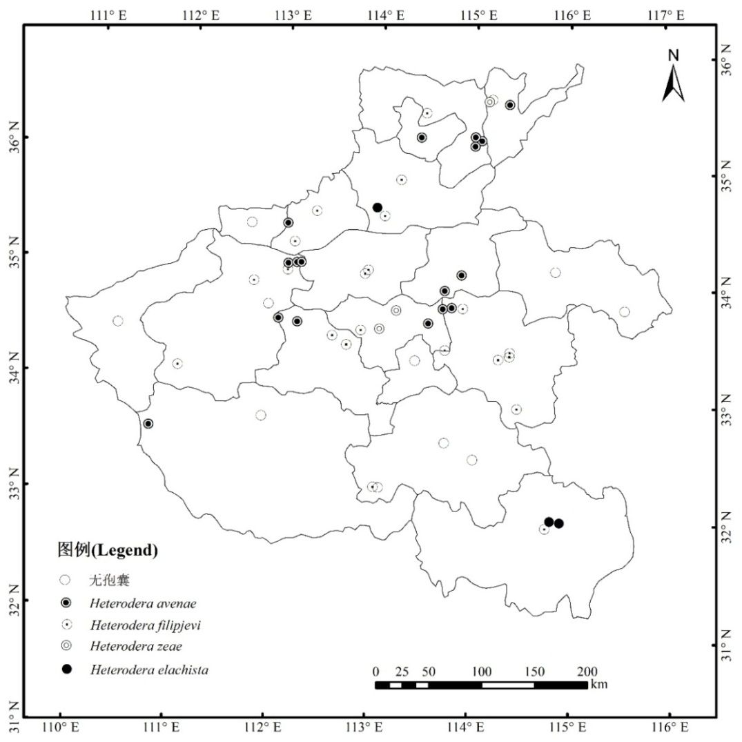 图2. 河南省小麦、玉米和水稻作物孢囊线虫种类发生区域分布图