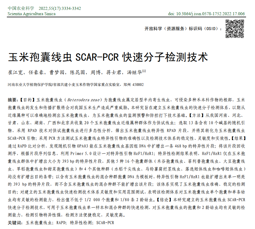 崔江宽等(2022)从我国河南、河北、甘肃、山东、湖南、广西和北京共收集20个玉米孢囊线虫近缘属种群体作为供试线虫。共计24个线虫群体,包括采自河南和广西的4个玉米孢囊线虫群体,河南、河北和山东的4个禾谷孢囊线虫群体和4个菲利普孢囊线虫群体,河南和湖南的3个旱稻孢囊线虫群体,河南、河北和甘肃的4个大豆孢囊线虫群体以及由中国农业科学院彭德良研究员馈赠的甜菜孢囊线虫DNA模板和本实验室保存的1个水稻干尖线虫(Aphelenchoides besseyi)群体、1个马铃薯腐烂茎线虫(Ditylenchus destructor)群体、1个落选短体线虫(Pratylenchus neglectus)群体和1个咖啡短体线虫(P. coffeae)群体。选取13条含有10个碱基的随机引物,采用RPAD技术对供试孢囊线虫进行多态性分析,筛出玉米孢囊线虫特异性RPAD片段,并将其转化为玉米孢囊线虫SCAR-PCR引物;采用PCR方法测试玉米孢囊线虫特异性引物的准确性以及检测技术体系的稳定性、灵敏度和实效性。