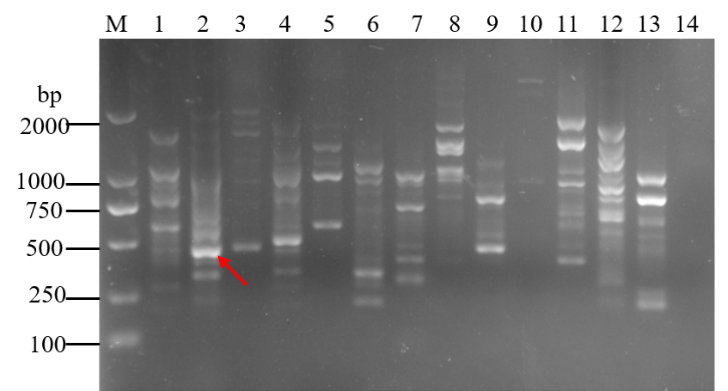 M:DL 2000DNA Marker;1—13:OPA02、OPA03、OPA06、OPA09、OPA13、OPA18、OPB15、OPC06、OPD13、OPG06、OPG08、OPG10、OPK16;14:阴性对照Negative control;箭头所指为特异性条带位置,The arrow indicates the specific band position.