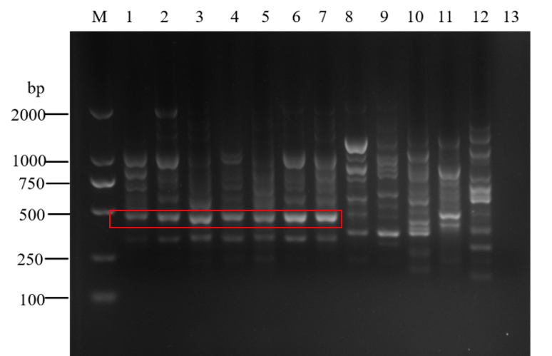 M:DL 2000DNA Marker;1—7:玉米孢囊线虫 Hz01-1、Hz01-2、Hz02-1、Hz02-2、Hz03-1、Hz03-2、Hz04 Hz01-1, Hz01-1, Hz02-1, Hz02-2, Hz03-1, Hz03-2, Hz04 population of H. zeae ;8—12:禾谷孢囊线虫 Ha01、菲利普孢囊线虫 Hf02、大豆孢囊线虫 Hg04、甜菜孢囊线虫 Hs01、旱稻孢囊线虫 He01 Ha01 population of H. avenae, Hf02 population of H. filipjevi, Hg04 population of H. glycines, Hs01 population of H. schachtii, He01 population of H. elachista;13:阴性对照Negative control;红框内为玉米孢囊线虫特异性条带,The red box indicates the specific bands of H. zeae.