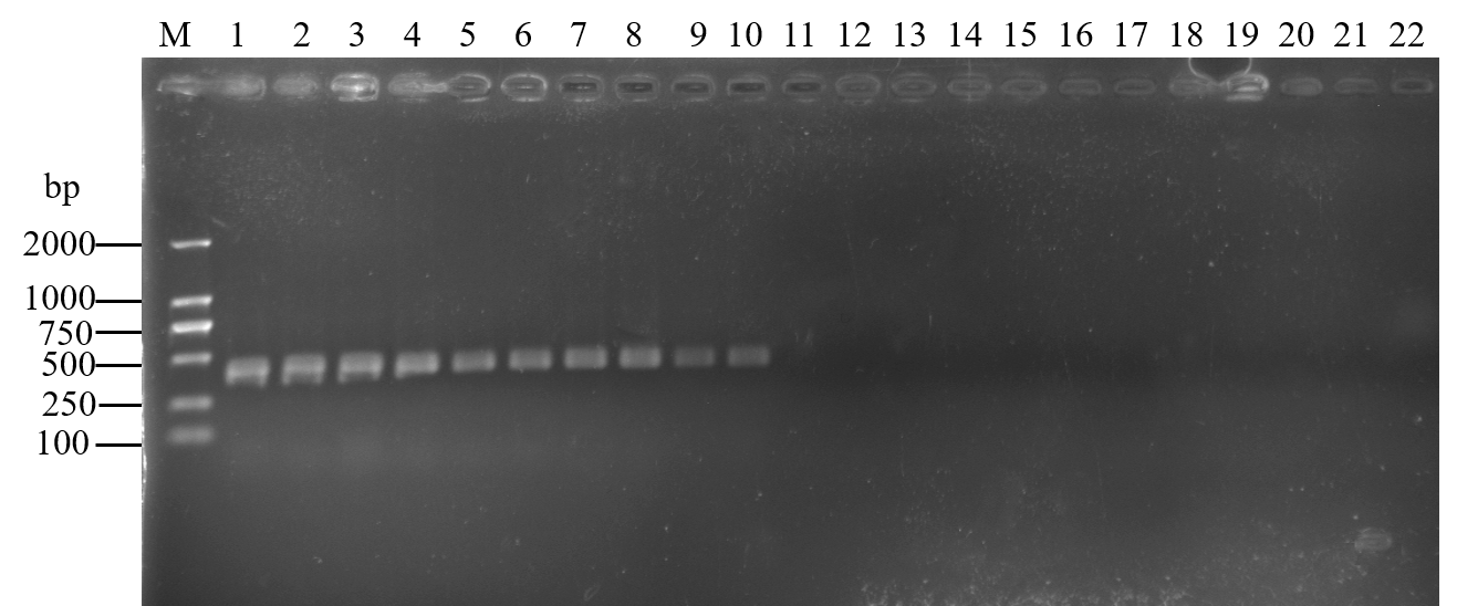 M:DL 2000DNA Marker;1—8:玉米孢囊线虫种群 Hz01-1、Hz01-2、Hz02-1、Hz02-2、Hz03-1、Hz03-2、Hz04-1、Hz04-2 Hz01-1, Hz01-2, Hz02-1, Hz02-2, Hz03-1, Hz03-2, Hz04-1 and Hz04-2 population of H. zeae;9:6种孢囊线虫混合种群孢囊DNA DNA of cyst of H. zeae and 5 related species populations;10:6种孢囊线虫混合种群J2幼虫DNA DNA of J2 of H. zeae and 5 related species populations;11:不含玉米孢囊线虫的5种孢囊线虫混合种群孢囊DNA DNA of cyst of 5 related species populations without H. zeae;12:不含玉米孢囊线虫的5种孢囊线虫混合种群J2幼虫DNA DNA of J2 of 5 related species populations without H. zeae;13—17:小麦禾谷孢囊线虫种群 Ha01、菲利普孢囊种群 Hf02、大豆孢囊线虫种群 Hg04、旱稻孢囊线虫种群 He01和甜菜孢囊线虫种群 Hs01 Ha01 population of H. avenae, Hf02 population of H. filipjevi, Hg04 population of H. glycines, He01 population of H. elachista, Hs01 population of H. schachtii;18—21:水稻干尖线虫 Ab01、马铃薯腐烂茎线虫 Dd01、落选短体线虫 Pn01和咖啡短体线虫 Pc01 Ab01 population of A. besseyi, Dd01 population of D. destructor, Pn01 population of P. neglectus, Pc01 population of P. coffeae;22:阴性对照Negative control