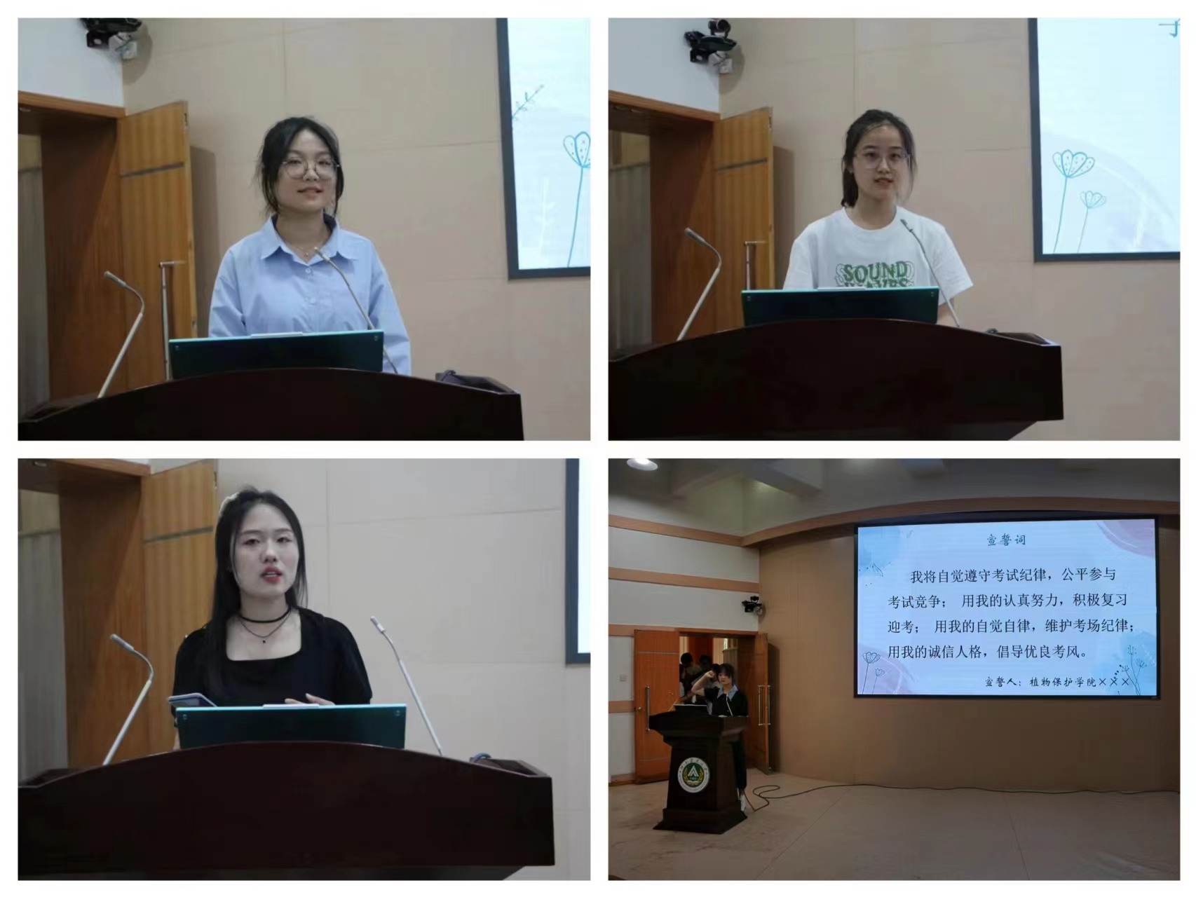 三位优秀学生代表结合自身状况从不同方面向同学们分享了备考经验。李青青分享了管理和规划时间的技巧,重视效率;翟曼佳强调要加强记忆,并且及时复习巩固;和紫慧分享了要注重利用网络资源,多了解相关知识。闫雨婷向同学们展示了线下考试的注意事项以及往届的挂科情况,希望同学们积极备考,取得优异成绩。马心如带领22级全体同学进行宣誓,承诺将严格遵守考试纪律。