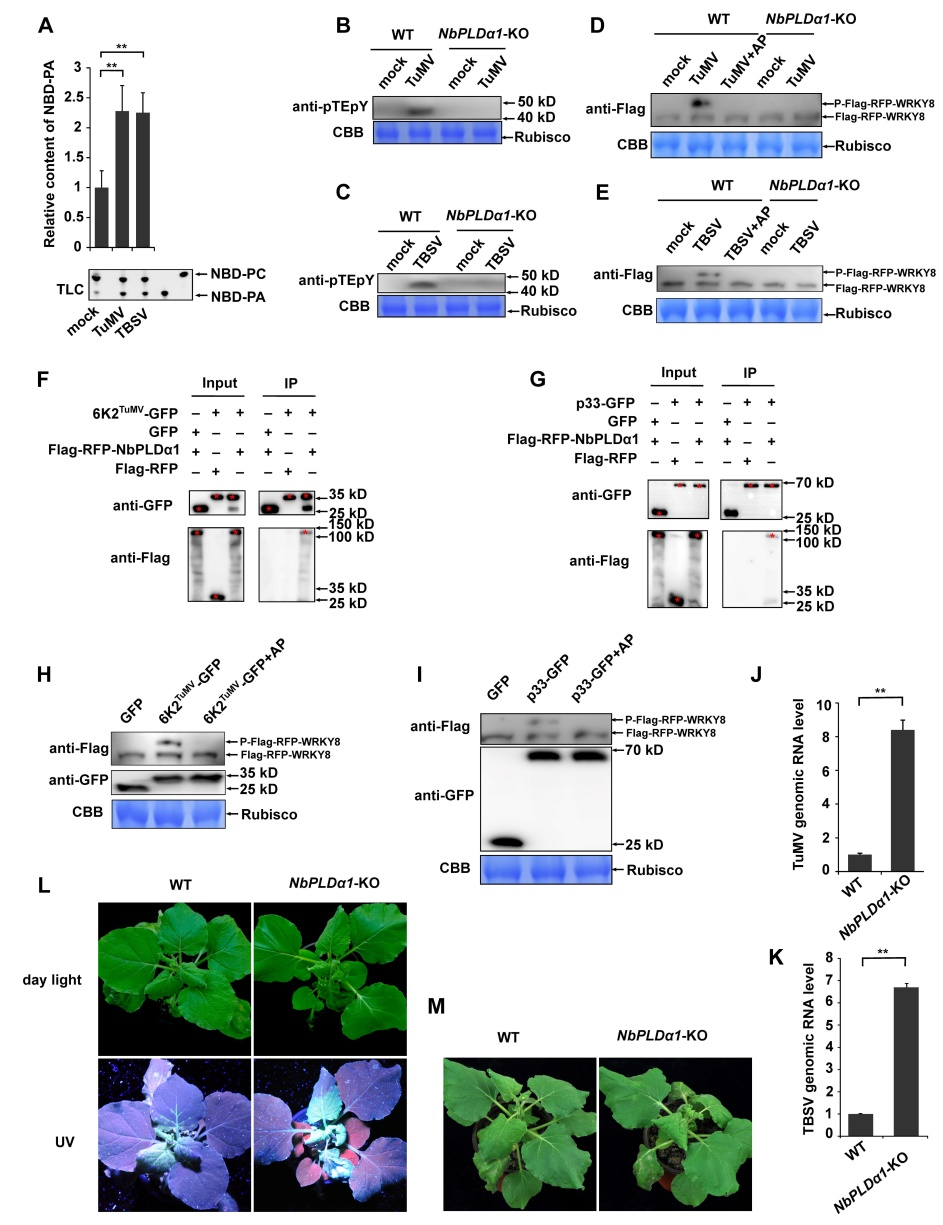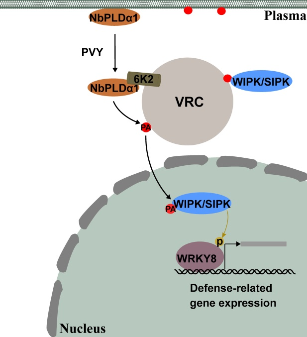本研究首先通过非靶向脂质组学方法,发现马铃薯Y病毒(Potato virus Y, PVY)侵染早期(0.5dpi)磷脂酸含量迅速增高。进一步通过转录组学分析、基因敲除以及互作验证,明确PVY编码的6K2蛋白通过与NbPLDα1互作,提高PA含量并将其募集至病毒复制复合体(VRCs)。基因敲除及化学抑制NbPLDα1均可促进PVY侵染,而喷施外源PA可抑制PVY侵染,表明NbPLDα1及其产物PA具有抗病毒作用。转录组学分析及体内磷酸化结果显示,PVY可激活植物MAPK免疫途径。基因敲除及化学抑制NbPLDα1削弱了PVY激活的MAPK免疫途径。进一步研究发现,PA可以结合WIPK/SIPK激酶并促使其磷酸化转录因子WRKY8,从而诱导下游防御相关基因表达(图2)。沉默MEK2-WIPK/SIPK-WRKY8途径可促进PVY侵染。这些结果表明,PA作为次级信号分子,响应PVY侵染,激活MAPK途径以抵抗病毒。