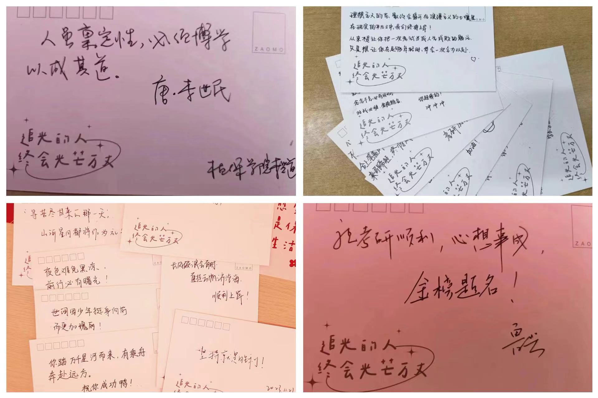 苦尽甘来即是今日,山河星月皆是贺礼。活动期间,李兴道、鲁兴副一行莅临现场,分别写下了对考研学子的励志祝语,为考研学子加油,送去冬日温暖,表达了对考研学生的关心问候,叮嘱同学们要保持定力、坚定信心、劳逸结合、准备充分,以最饱满的精神状态参加考试。同学们纷纷表示,此次活动不仅鼓舞了考研学生的信心,而且活动参与者通过书写祝福,也收获了快乐和对未来美好向往。