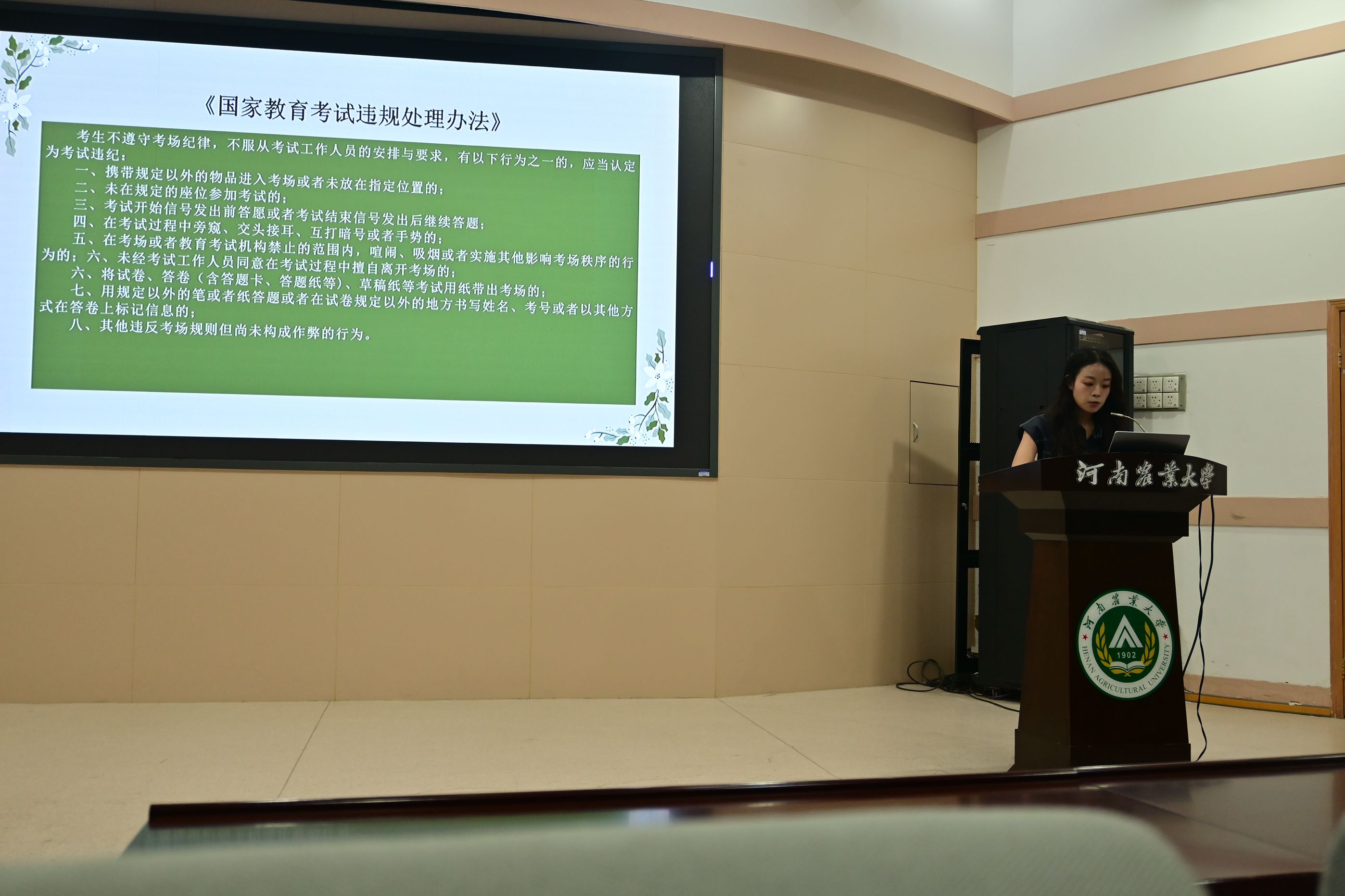 于文化路校区报告厅召开诚信考试动员大会,辅导员代琳及23级全体本科生参加活动,会议由学实部王思语主持。