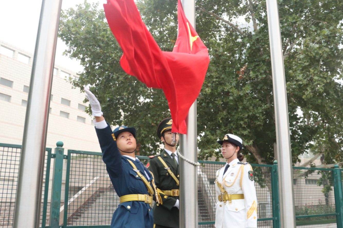 在初升朝阳的映照下,国旗护卫队迈着整齐划一、铿锵有力的步伐,护卫着鲜艳的五星红旗入场,伴随着雄壮的国歌,鲜艳的五星红旗在晨光中冉冉升起,全体师生庄严肃立,奏唱国歌,向国旗行注目礼。