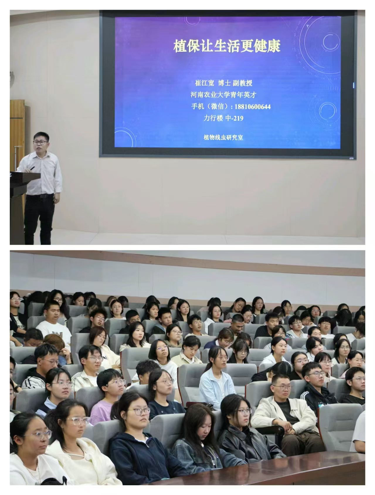 于文化路校区300人报告厅举办“植保让生活更健康”绿航大讲堂。全体2024级新生参加讲座,讲座由崔江宽副教授主讲,2024级辅导员郭俊阳主持。