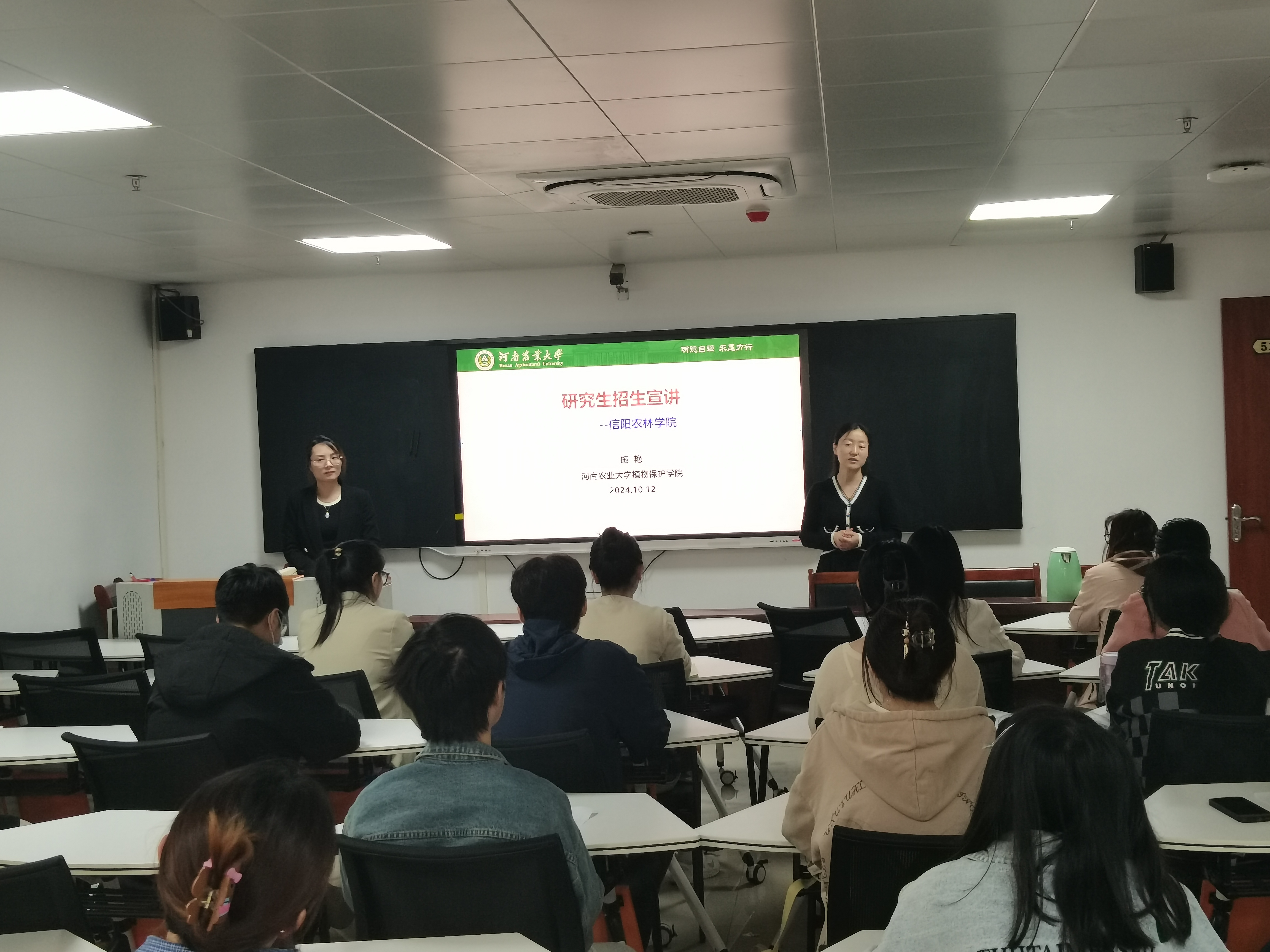 本网讯(通讯员 何磊鸣 图片 何磊鸣)为加深两校之间的学术交流与合作, 助力信阳农林学院学子继续深造,10月12日,副院长施艳与青年教师何磊鸣到信阳农林学院农学院,为广大在校学生开展了一场生动而深入的研究生招生宣传活动。