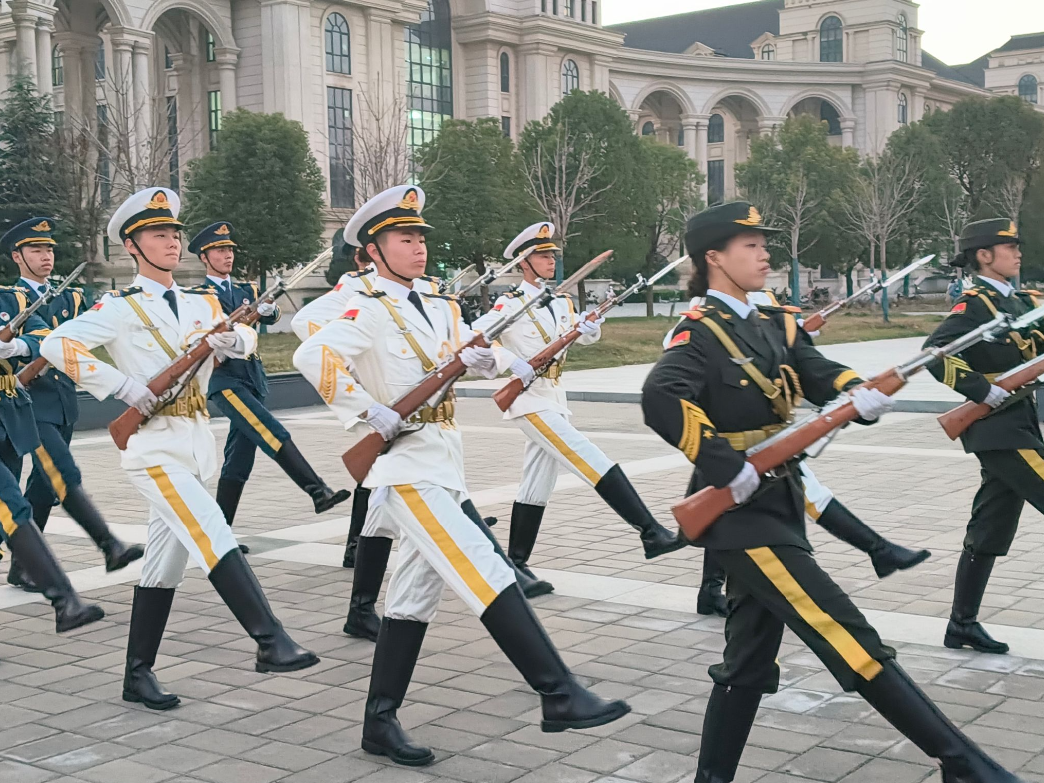 晨曦微露,金色的阳光洒向校园。国旗护卫队身姿挺拔,护送国旗稳步前行。国歌奏响那刻,红旗徐徐攀升,师生们站姿端正、神情庄重,行注目礼,奏唱国歌。