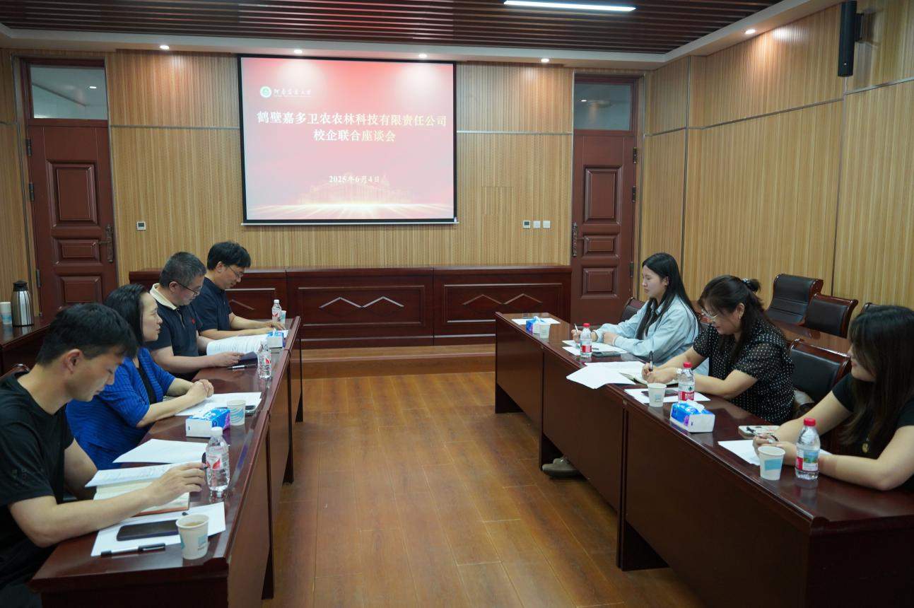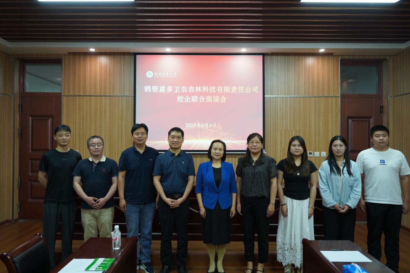 农林有害生物综合防控团队负责人尹新明教授与鹤壁嘉多卫农农林科技有限责任公司董事长赵慧媛进行校企联合座谈。